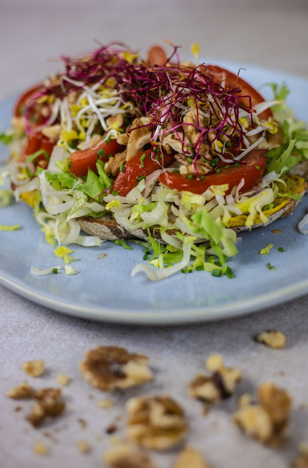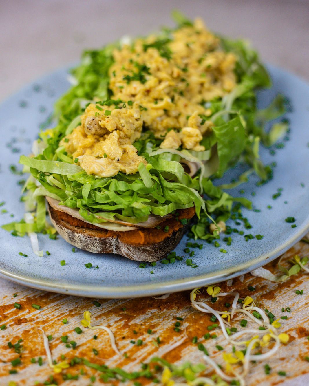 1x Scheibe Holzofenbrot, Linsen-Curry-Aufstrich, Salat der Saison, marinierte Tomate, geröstete Sonnenblumenkerne