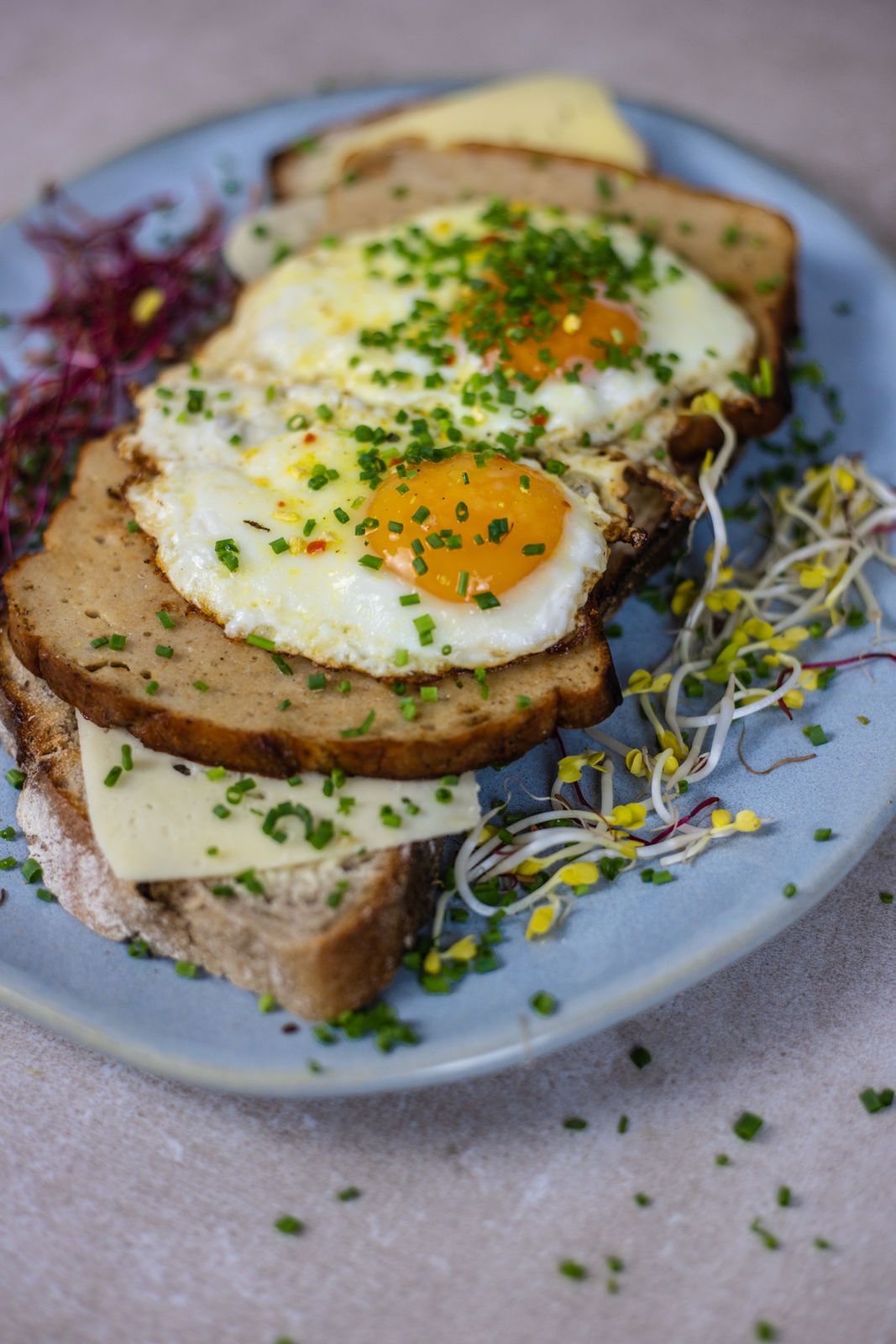 1 Scheibe Holzofenbrot, gebratener Fleischkäse & Käse, 2 Spiegeleier